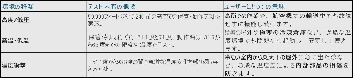 1.ミッションプロファイルの重視: 旧版(810G)よりも、機器が実際に使用されるミッションプロファイル(運用シナリオ)に合わせたテストを優先しています。これにより、より現実に即した耐久性評価が可能になります。 2.多軸シミュレーションの強化: 振動解析において、より複雑な実際の環境を模倣する多軸試験やシミュレーションが強化されています。 この規格に準拠しているとされる市販の製品(例:ノートPC、スマートフォン)は、MIL-STD-810の項目から一部を選んで試験を実施し、特定の環境耐性を満たしていることを示しています。ただし、メーカーが独自に設定した条件で試験されている場合もあります。