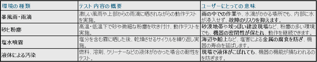特に規定はないですが、軍用レベルで運用や本当に厳しい環境に使用されるには20項目以上の堅牢性試験をパスしたものが好ましいとされています。